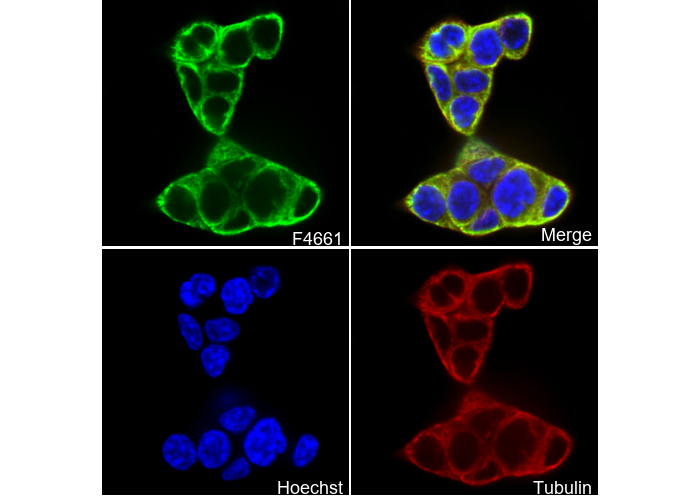 • Immunofluorescent analysis of HT-29 cells using F4661 (green, 1:200), Hoechst (blue) and tubulin (Red).