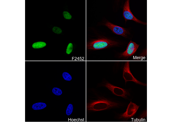 • Immunofluorescent analysis of Hela cells using F2452 (green, 1:50), Hoechst (blue) and tubulin (Red).