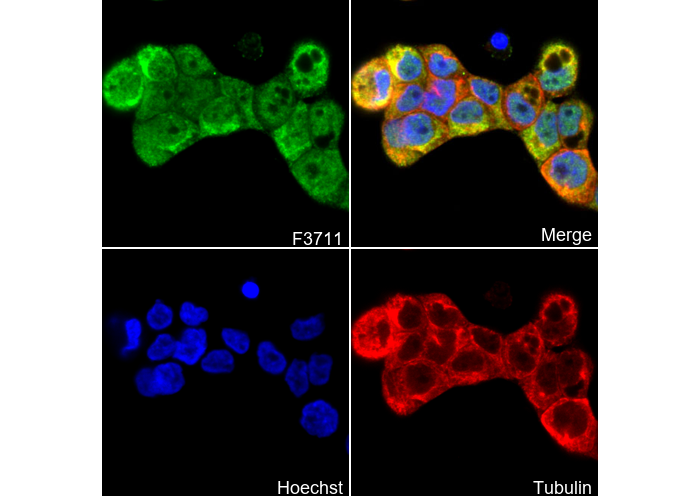 • Immunofluorescent analysis of A431 cells using F3711 (green, 1:100), Hoechst (blue) and tubulin (Red).