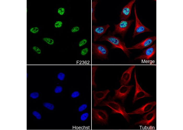 • Immunofluorescent analysis of Hela cells using F2362 (green, 1:100), Hoechst (blue) and tubulin (Red).