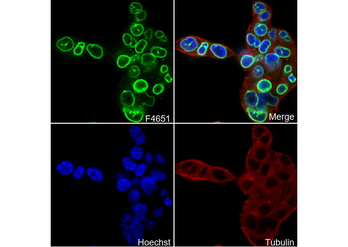 • Immunofluorescent analysis of HT-29 cells using F4651 (green, 1:50), Hoechst (blue) and tubulin (Red).
