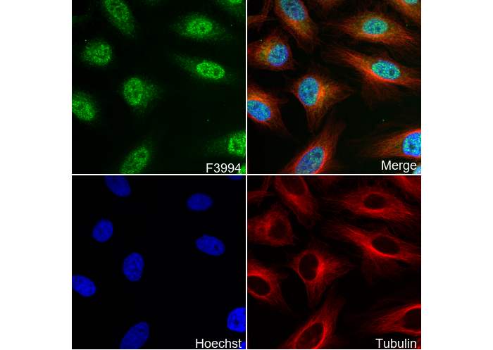 • Immunofluorescent analysis of Hela cells using F3994 (green, 1:180), Hoechst (blue) and tubulin (Red).