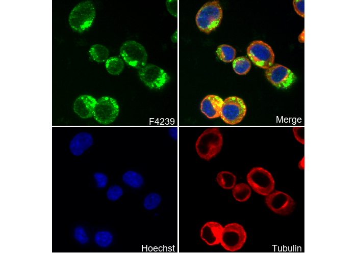 • Immunofluorescent analysis of Neuro-2a cells using F4239 (green, 1:200), Hoechst (blue) and tubulin (Red).