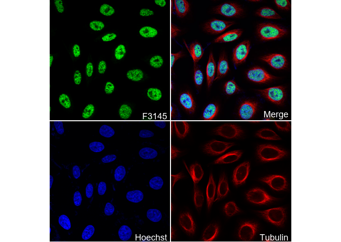 • Immunofluorescent analysis of HepG2 cells using F3145 (green, 1:300), Hoechst (blue) and tubulin (Red).