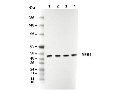• Lane 1: A431, Lane 2: Hela, Lane 3: COS-7, Lane 4: MEK-WT