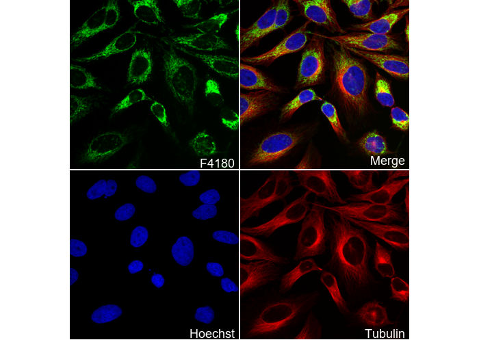 • Immunofluorescent analysis of Hela cells using F4180 (green, 1:50), Hoechst (blue) and tubulin (Red).