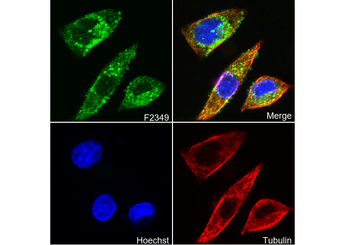 • Immunofluorescent analysis of HepG2 cells using F2349 (green, 1:40), Hoechst (blue) and tubulin (Red).