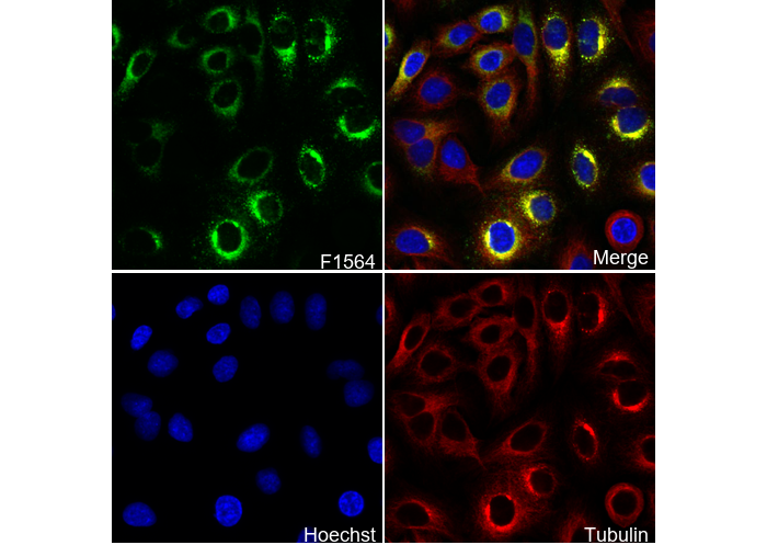 • Immunofluorescent analysis of A549 cells using F1564 (green, 1:100), Hoechst (blue) and tubulin (Red).