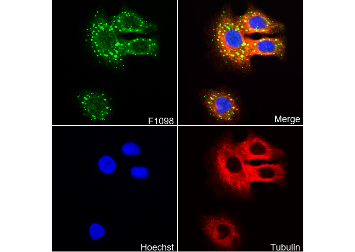 • Immunofluorescent analysis of A549 cells using F1098 (green, 1:200), Hoechst (blue) and tubulin (Red).