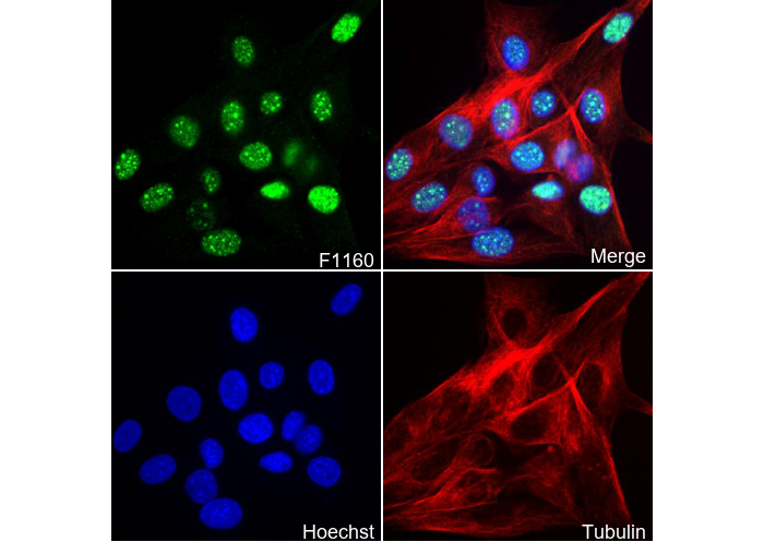 • Immunofluorescent analysis of C2C12 cells treated with 2% horse serum, using F1160 (green, 1:90), Hoechst (blue) and tubulin (Red).