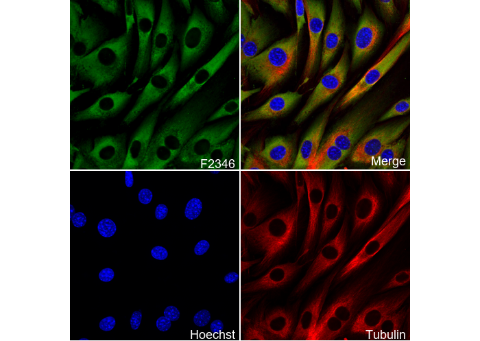 • Immunofluorescent analysis of C2C12 cells using F2346 (green, 1:30), Hoechst (blue) and tubulin (Red).