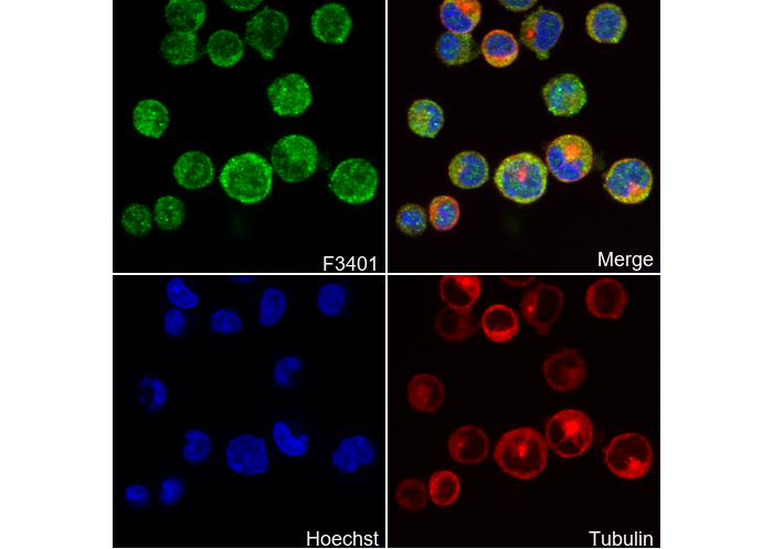• Immunofluorescent analysis of K562 cells using F3401 (green, 1:300), Hoechst (blue) and tubulin (Red).