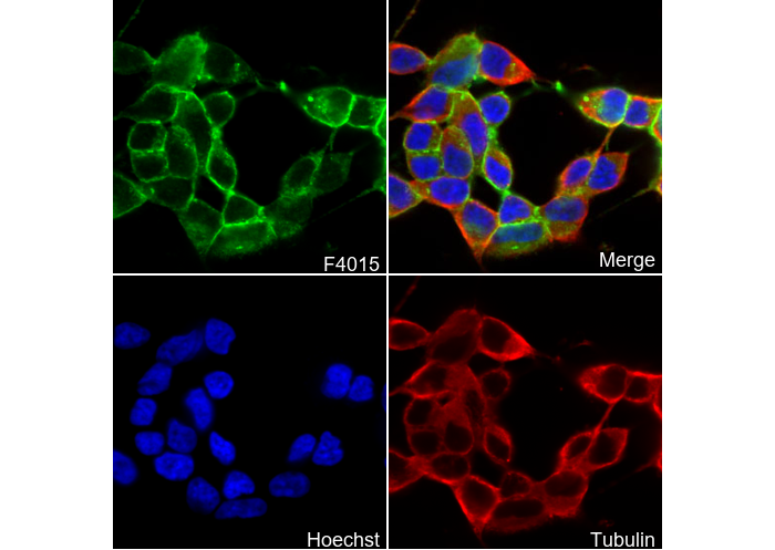 • Immunofluorescent analysis of SH-SY5Y cells using F4015 (green, 1:50), Hoechst (blue) and tubulin (Red).