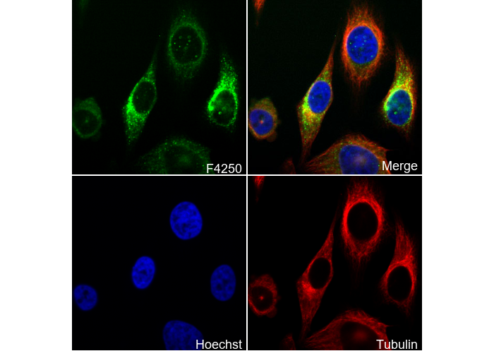 • Immunofluorescent analysis of Hela cells using F4250 (green, 1:1600), Hoechst (blue) and tubulin (Red).
