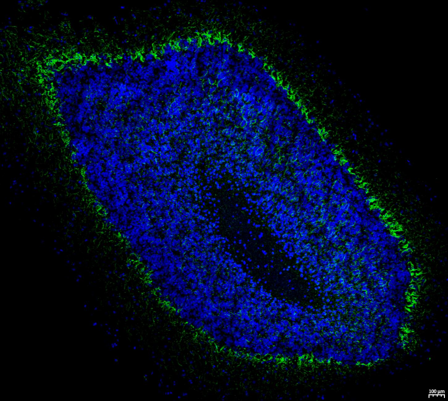 • Immunofluorescent analysis of Rat cerebellum tissue using F0440 (green, 1:100) and Hoechst (blue).
