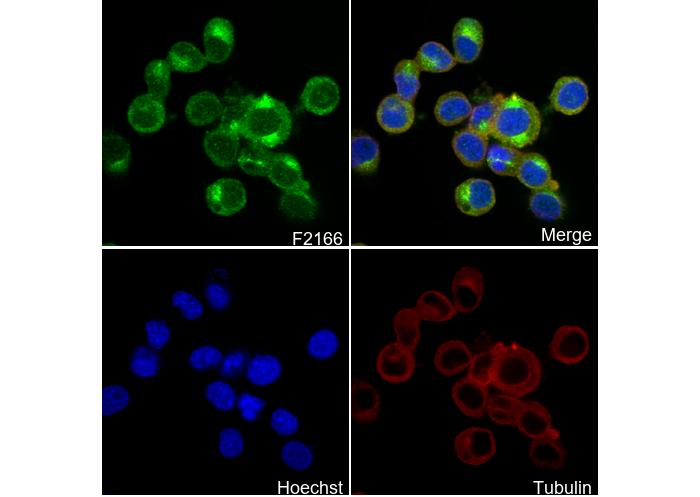 • Immunofluorescent analysis of Neuro-2a cells using F2166 (green, 1:70), Hoechst (blue) and tubulin (Red).