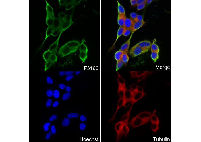 • Immunofluorescent analysis of SH-SY5Y cells using F3166 (green, 1:2000), Hoechst (blue) and tubulin (Red).