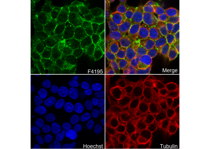 • Immunofluorescent analysis of 293T cells using F4195 (green, 1:400), Hoechst (blue) and tubulin (Red).