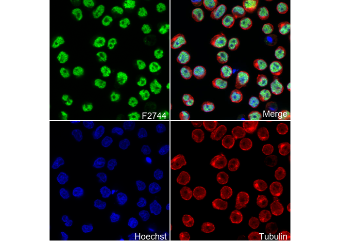 • Immunofluorescent analysis of Ramos cells using F2744 (green, 1:200), Hoechst (blue) and tubulin (Red).