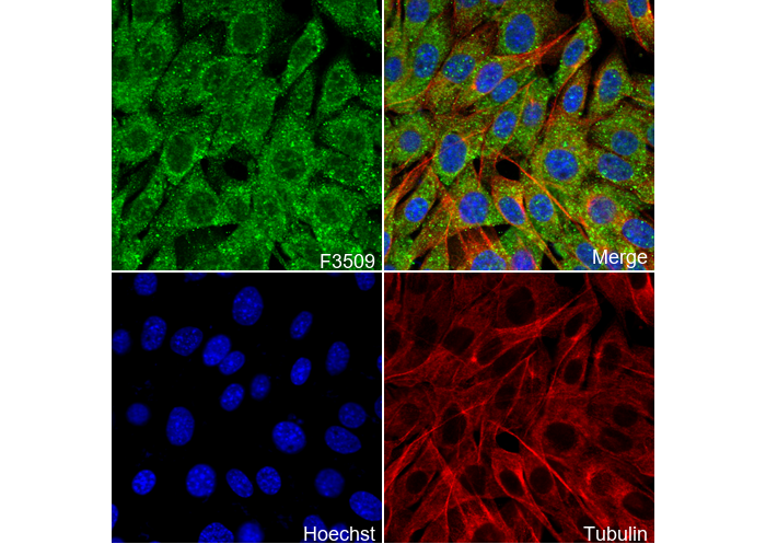 • Immunofluorescent analysis of NIH/3T3 cells using F3509 (green, 1:100), Hoechst (blue) and tubulin (Red).