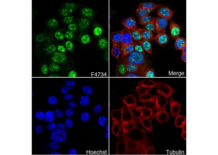 • Immunofluorescent analysis of HCT 116 cells using F4734 (green, 1:200 ), Hoechst (blue) and tubulin (Red).