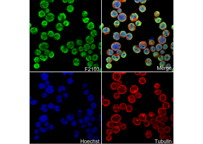 • Immunofluorescent analysis of Jurkat cells using F2103 (green, 1:100), Hoechst (blue) and tubulin (Red).
