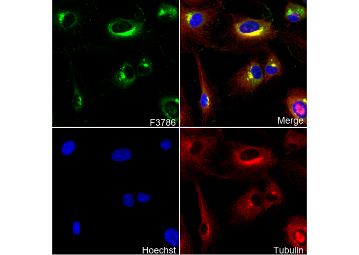 • Immunofluorescent analysis of HUVEC cells using F3786 (green, 1:10000), Hoechst (blue) and tubulin (Red).