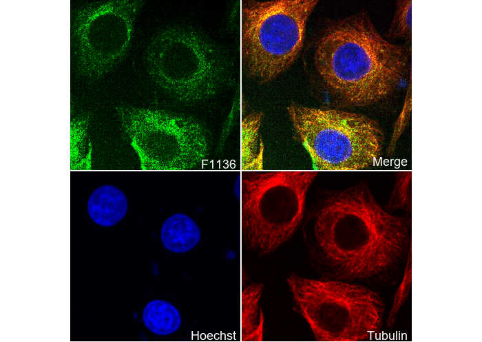 • Immunofluorescent analysis of HepG2 cells using F1136 (green, 1:50), Hoechst (blue) and tubulin (Red).