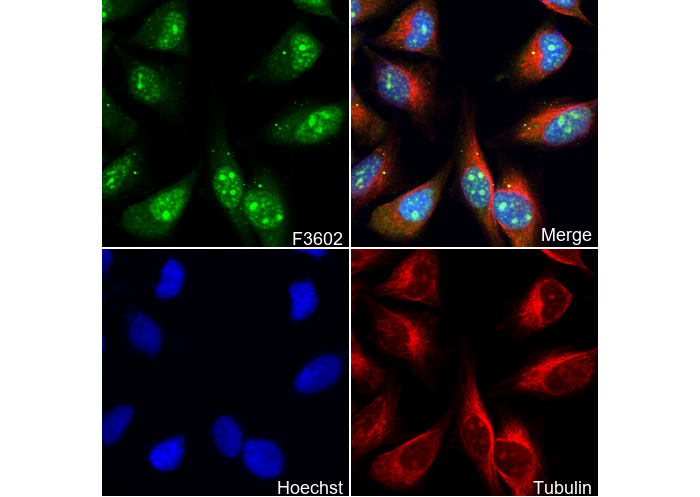 • Immunofluorescent analysis of Hela cells using F3602 (green, 1:100), Hoechst (blue) and tubulin (Red).
