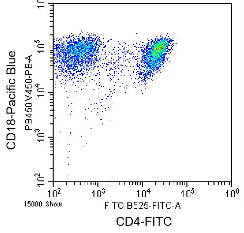 • Staining of normal human peripheral blood mononuclear cells (PBMCs) using FITC Anti-CD4 Antibody and PB Anti-CD18 Antibody (Clone: YFC118.3) (Product No.: H1300). Analyzed data are derived from monocytes.