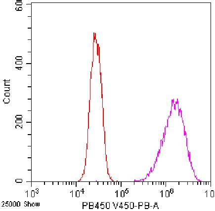 • Staining of permeabilized J774A.1 cell line cells (permeabilized using fixation/permeabilization buffer) using PB Anti-CD68 Antibody (Clone: FA-11) (Product No.: G0505) (magenta) and unstained control (red). Analyzed data are derived from total cells.