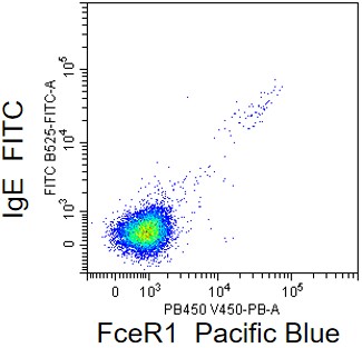 • Staining of normal human peripheral blood mononuclear cells (PBMCs) using FITC Anti-IgE Antibody and PB Anti-FCER1A Antibody (Clone: AER-37) (Product No.: H0775). Analyzed data are derived from lymphocytes.