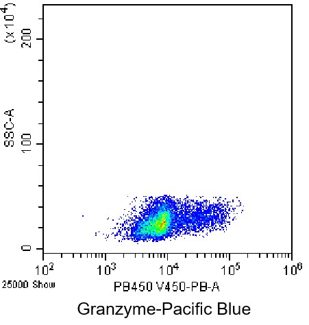 • Intracellular staining of fixed/permeabilized normal human peripheral blood mononuclear cells (PBMCs) using PB Anti-Granzyme B Antibody (Clone: GB11) (Product No.: H0400). Analyzed data are derived from cells gated on lymphocytes.