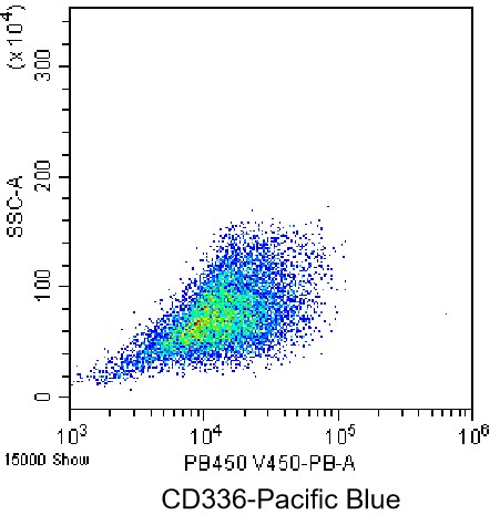 • Staining of healthy human peripheral blood mononuclear cells (HPBMCs) stimulated with PHA at a final concentration of 1µg/mL for 3 days using PB Anti-Human CD366 Antibody (Clone: F38-2E2) (Product No.: H3655). Analyzed data are derived from total cells.