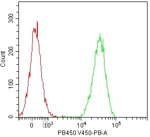 • Staining of platelet-enriched normal human peripheral blood using PB Anti-Human CD41a Antibody (Clone: HIP8) (Product No.: H0895) (green, red is blank control). During acquisition, the threshold in the acquisition parameters needs to be reduced and a logarithmic axis should be used to better distinguish platelet cells. Analyzed data are derived from platelet cells.