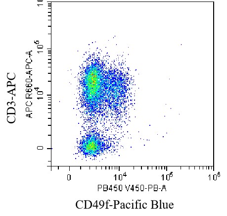 • Staining of normal human peripheral blood mononuclear cells (PBMCs) using APC Anti-CD3 Antibody and PB Anti-Human CD49f Antibody (Clone: GoH3) (Product No.: H0535). Analyzed data are derived from lymphocytes.