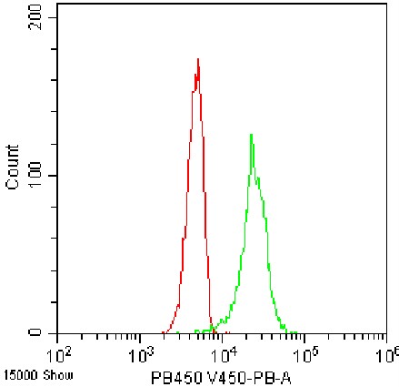 • Staining of normal human peripheral blood mononuclear cells (PBMCs) using PB Anti-Human CD54 Antibody (Clone: HA58) (Product No.: H1255) (green, red is blank control). Analyzed data are derived from lymphocytes.