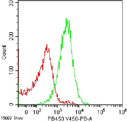 • Staining of platelet-enriched normal human peripheral blood using PB Anti-Human CD63 Antibody (Clone: H5C6) (Product No.: H1330) (green, red is blank control). Analyzed data are derived from lymphocytes.