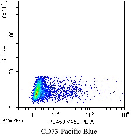 • Staining of normal human peripheral blood mononuclear cells (PBMCs) using PB Anti-Human CD73 Antibody (Clone: AD2) (Product No.: H0370). Analyzed data are derived from lymphocytes.