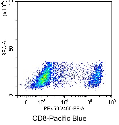 • Staining of normal human peripheral blood mononuclear cells (PBMCs) using PB Anti-Human CD8 Antibody (Clone: SK1) (Product No.: H0550). Analyzed data are derived from lymphocytes.