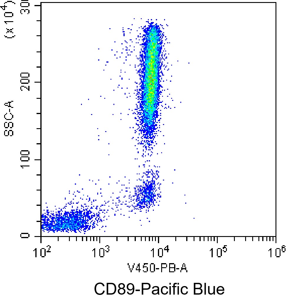 • Staining normal human peripheral blood granulocytes with PB Human CD89 Antibody (Clone: A59) (Product Number: H2440). Analysis was performed on total live cells.