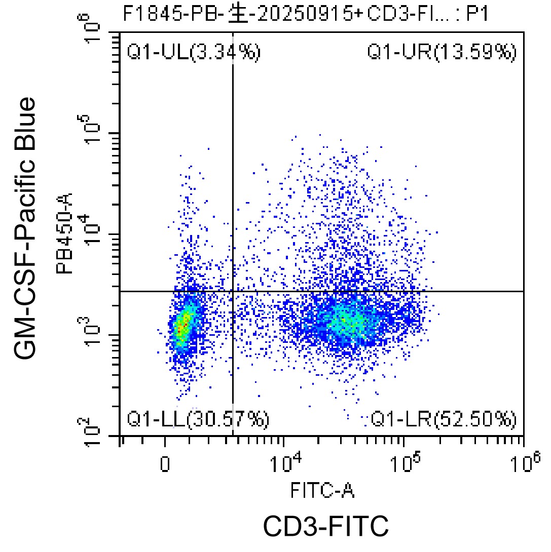 • Staining normal human peripheral blood mononuclear cells (PBMCs) that were stimulated with Cell Activation Cocktail (with Brefeldin A) for 3 days and fixed/permeabilized with fixation/permeabilization buffer with PB Human GM-CSF Antibody (Clone: BVD2-21C11) (Product Number: H1900) and FITC CD3 Antibody. Analysis was performed on lymphocytes.