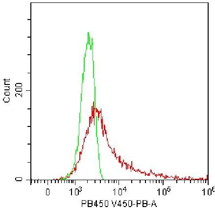 • Staining of HLA-A2 positive normal human peripheral blood mononuclear cells (PBMCs) using PB Anti-Human HLA-A2 Antibody (Clone: BB7.2) (Product No.: H1795) (red, green is blank control). Analyzed data are derived from monocytes.