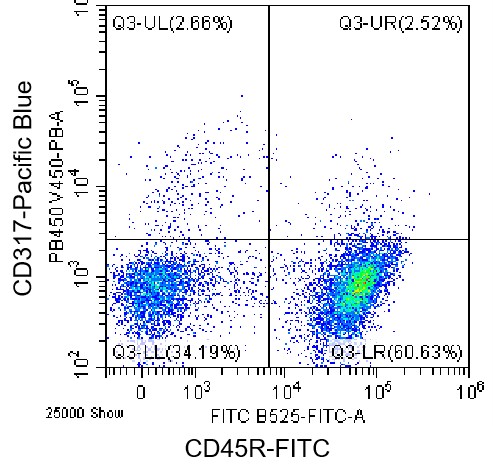 • Staining of C57BL/6 mouse splenic lymphocytes using FITC CD45R Antibody and PB Mouse CD317 Antibody (Clone: 927) (Catalog Number: G1420). Analysis data derived from live lymphocytes.