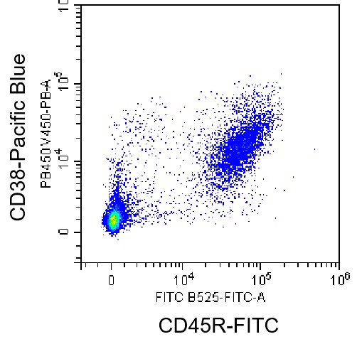• Staining of splenic lymphocytes from C57BL/6 mice using FITC Anti-CD45R Antibody and PB Anti-Mouse CD38 Antibody (Clone: 90) (Product No.: G0850). Analyzed data are derived from live lymphocytes.