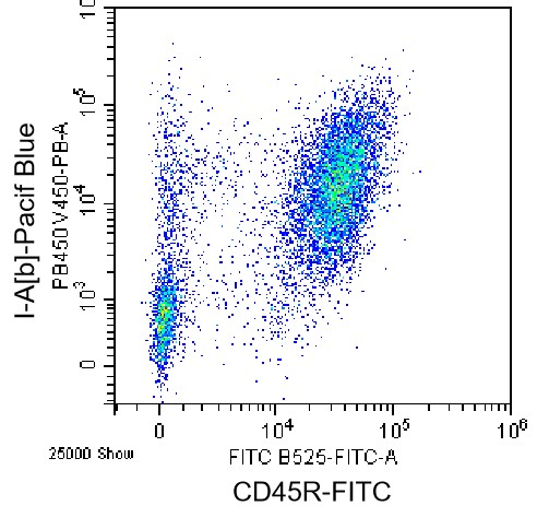 • Staining of C57BL/6 mouse splenic lymphocytes using FITC CD45R Antibody and PB Mouse I-A[b] Antibody (Clone: AF6-120.1) (Catalog Number: G1510). Analysis data derived from live lymphocytes.