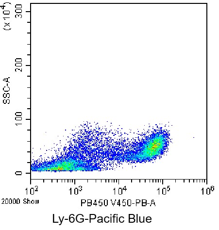 • Staining of bone marrow cells from C57BL/6 mice using PB Anti-Mouse Ly6G Antibody (Clone: 1A8) (Product No.: G4435). Analyzed data are derived from live lymphocytes.