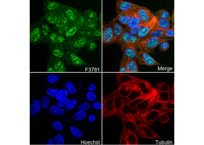 • Immunofluorescent analysis of DLD cells using F3781 (green, 1:500), Hoechst (blue) and tubulin (Red).