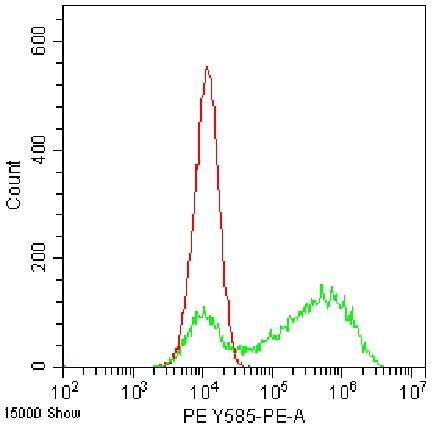 • Staining of fixed/permeabilized HEK-293F cells transfected with pLV3-CMV-ABCG2(human)-3×FLAG-Puro plasmid using PE Anti-BCRP1 Antibody (Clone: 5D3) (Product No.: H2987) (green, red is blank control). Analyzed data are derived from total cells.