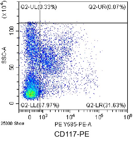 • Staining of bone marrow cells from C57BL/6 mice using PE Anti-CD117/c-Kit Antibody (Clone: 2B8) (Product No.: G4052). Analyzed data are derived from total live cells.